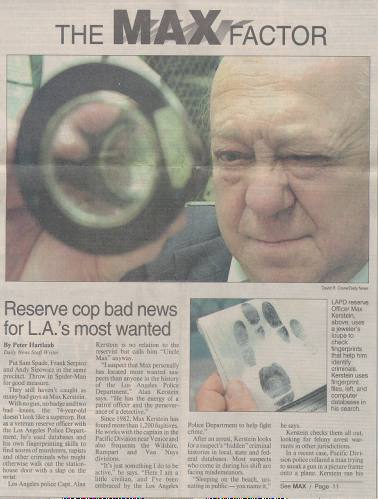 Kerstein’s specialty is visiting various divisions of the Los Angeles Police Department and auditing the in-custody criminal histories after their records have been initially checked. Through this effort he has not only identified persons who were wanted, including parolees and prison escapees, but he has also counseled the officers and record clerks on how they can be more proficient in their initial criminal history checks.  He is a highly respected by the LAPD as criminal computer expert and has found millions of dollars in lost revenues for the LAPD.